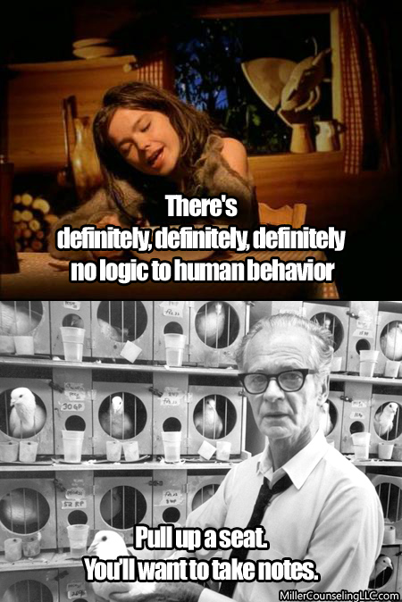bfskinnerbjorklol2On topics where his theories are best-validated, he writes with confidence, even benevolence towards his detractors. When he hits the edges of what behaviorism adequately explains, a detectable hint of snippiness leaks through.  Knowledge? It’s a behavior of responses reinforced by others telling us we are right. Language? It’s a behavior reinforced by people responding the way we like when we speak. Creativity? It’s the behavior of experimenting with different combinations until something reinforcing emerges.  Thought? It’s a behavior, too. Or anyway it’s the mental articulation of words, so it might as well be the same thing.What goes on in the brain? It doesn’t matter. Physiologists, he says with a sniff, will someday understand.